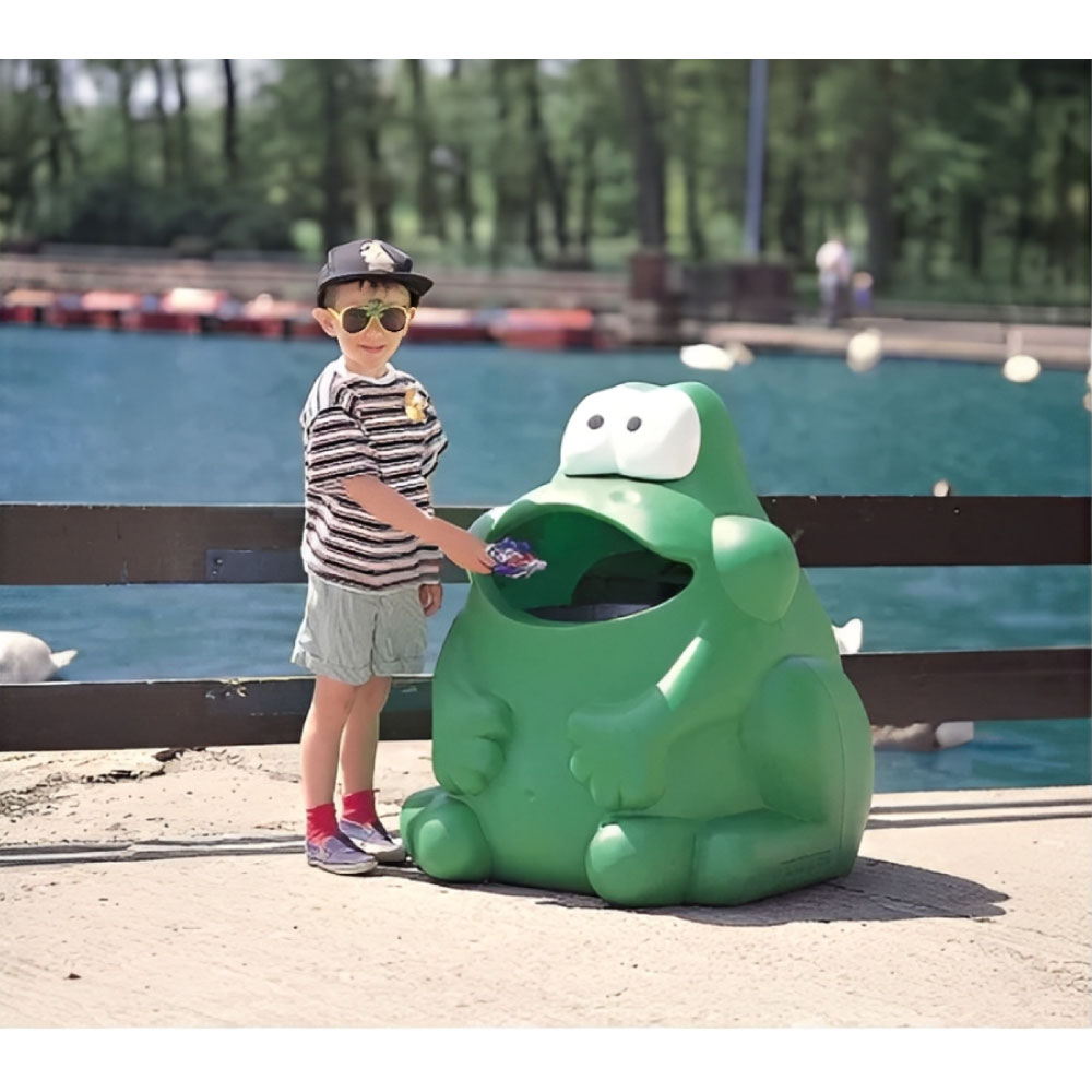 Lustiger Abfallbehälter in Frosch-Optik für den Innen- und Aussenbereich. Der kinderfreundliche Abfalleimer ist eine tolle Ergänzung für Spielplätze, Wasserparks, Kindergärten, Zoos und sonstige Innen- oder Aussenbereiche, wo sich Kinder aufhalten. Im Inneren der Tierfigur verbirgt sich ein verzinkter Behälter aus Stahlblech, der zur einfachen Entleerung dient. Hergestellt aus Durapol™-Verbundkunststoff ist er bestens gegen Witterungen geschützt und einfach zu reinigen mittels Wasser oder Reinigungsmittel. Kann am Boden verankert werden. Die Tür in der Rückwand kann mittels Dreikantschlüssel verschlossen werden.