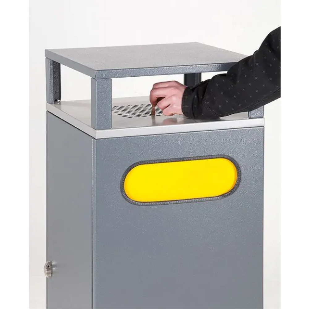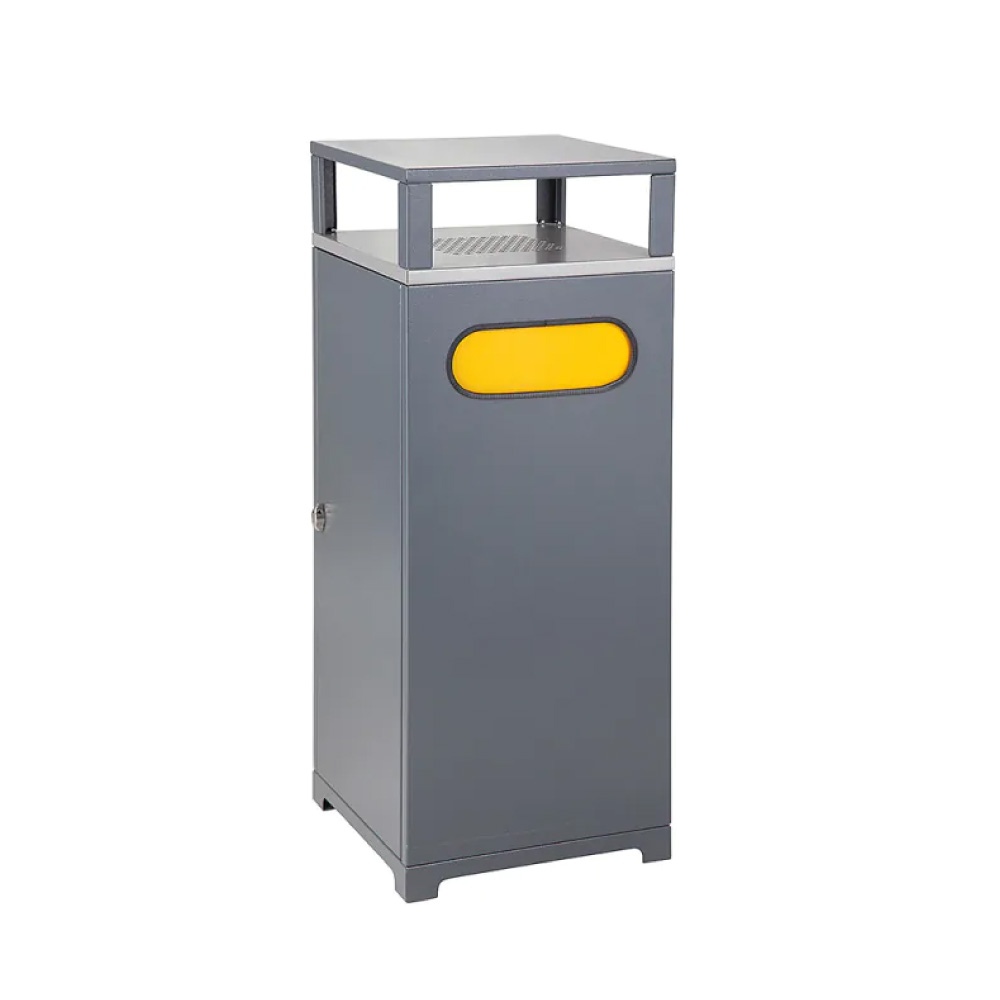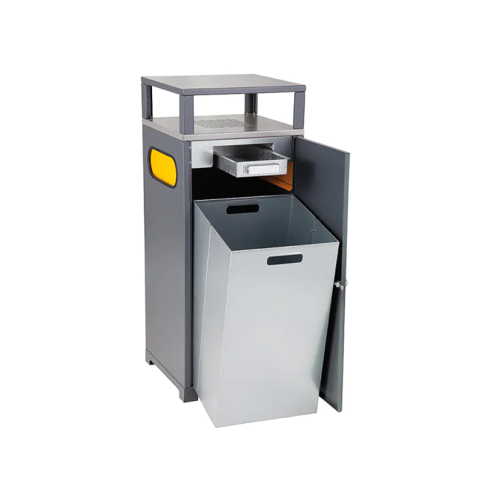 Der Abfallbehälter aus verzinktem Metall mit integriertem Aschenbecher ist eine robuste und langlebige Lösung für öffentliche Aussenbereiche. Gefertigt aus 1,5 mm starkem, verzinktem Blech und zusätzlich pulverbeschichtet, bietet der Abfallbehälter einen hohen Schutz vor Korrosion und mechanischen Beschädigungen. Zwei gegenüberliegende Einwurföffnungen mit Geruchsklappen ermöglichen eine komfortable und saubere Abfallentsorgung. Der abgedeckte Aschenbecher mit separatem Fach für Zigarettenstummel sorgt für eine sichere und ordentliche Entsorgung von Rauchabfällen. Im Inneren befindet sich eine verzinkte 90-Liter-Einlage, während Füsse mit Verankerungsmöglichkeit und ein drehbarer, abschliessbarer Verschluss den Abfallbehälter besonders vandalismussicher machen.