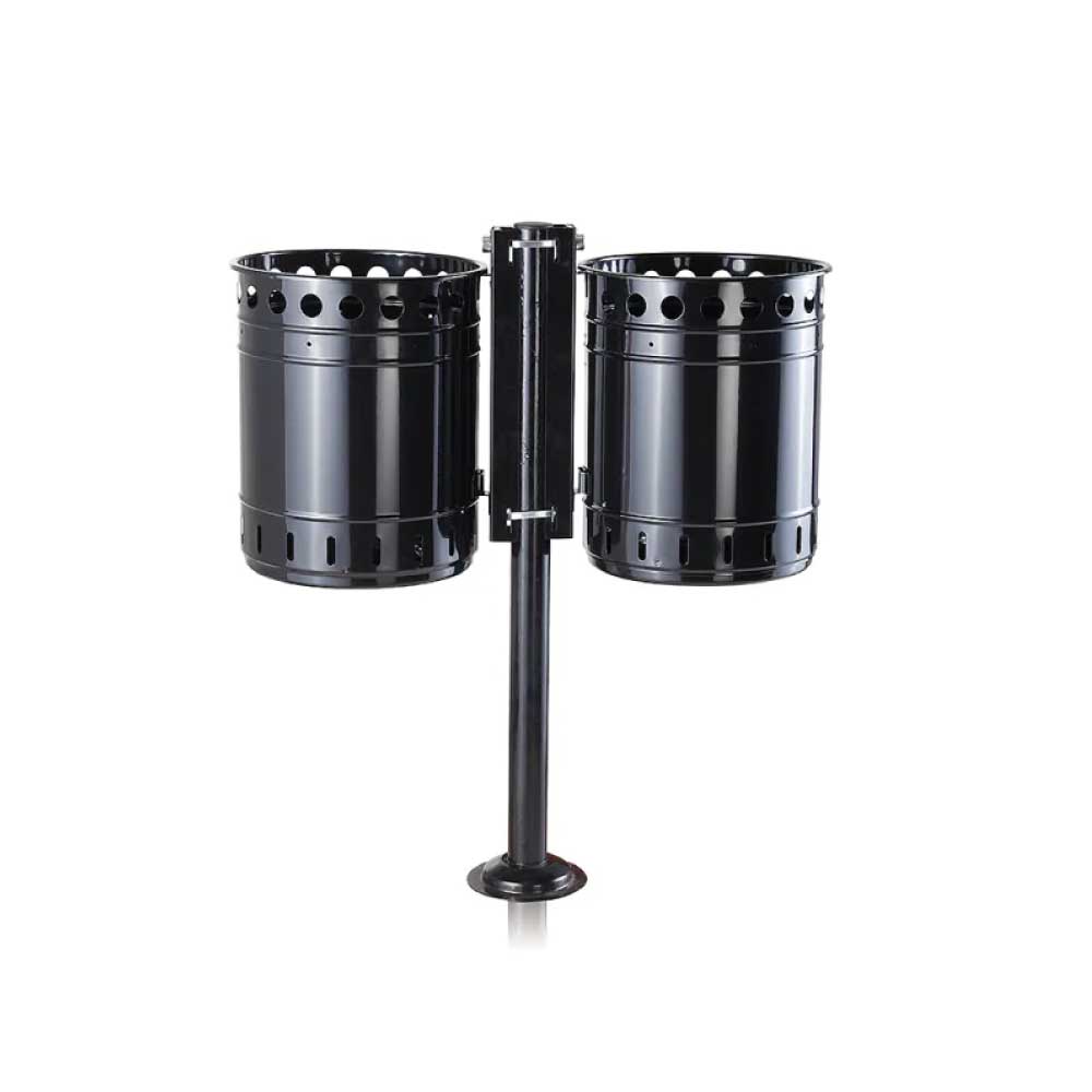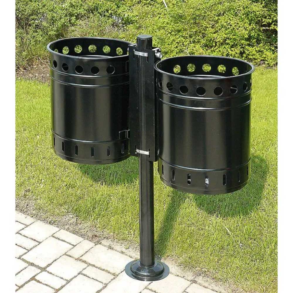 Der zweifache Abfallbehälter mit jeweils 35 Litern Fassungsvermögen ist ideal für stark frequentierte Plätze, Grünanlagen und öffentliche Bereiche. Dank der zwei separaten Abfallkörbe ermöglicht er eine effiziente Abfallsammlung und sorgt für Ordnung im Aussenbereich. Die Konstruktion aus verzinktem Stahl mit pulverbeschichteter Oberfläche macht den Abfallbehälter besonders langlebig und korrosionsbeständig. Durch sein zeitloses Design fügt sich der Abfallbehälter harmonisch sowohl in moderne Stadtzentren als auch in historische Altstädte ein. Die beiden Behälter sind mittels Spezialschloss am Pfosten gesichert und lassen sich zur Entleerung einfach und schnell öffnen.
