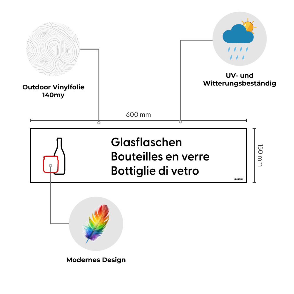 Ein hochwertiger Outdooraufkleber unserer Eigenmarke avakuk® der Ihrem Stahl- oder Kunststoffcontainer eine eindeutige Kennzeichnung verleiht. Der Containeraufkleber sieht optisch schön aus und ist durch den UV-Lack und der Outdoor Vinylfolie bestens für den Einsatz im Freien geeignet. Durch seine Grösse von 600 x 150 mm wird der Aufkleber verhindern, dass unerwünschte Gegenstände in den Container geworfen werden.