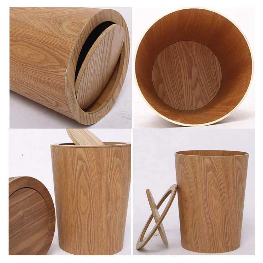 Ein eleganter Mülleimer aus Holz mit Schwenkdeckel, perfekt für Hotels, Badezimmer, Wohnzimmer oder wo auch immer ein kompakter Mülleimer benötigt wird. Der Mülleimer verfügt über einen Schwenkdeckel mit integrierten Magneten, wobei sich der Deckel beim Drehen wieder horizontal ausrichtet.