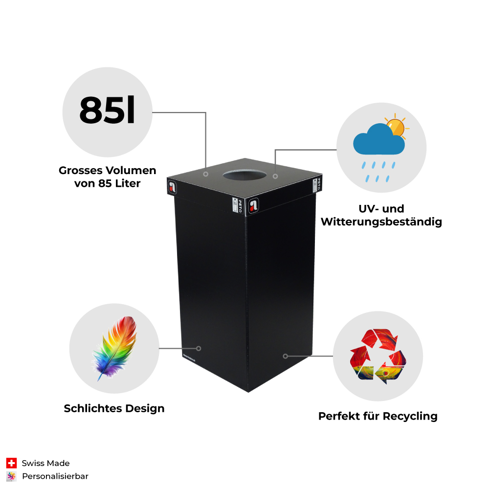 Der 85l PET-Sammelbehälter Blackbox 3.0 ist die perfekte Lösung für die mühelose Sammlung von Wertstoffen. Durch sein einzigartiges Design passt er sich jeder Umgebung an, ob in Ihrem Zuhause oder im Betrieb.