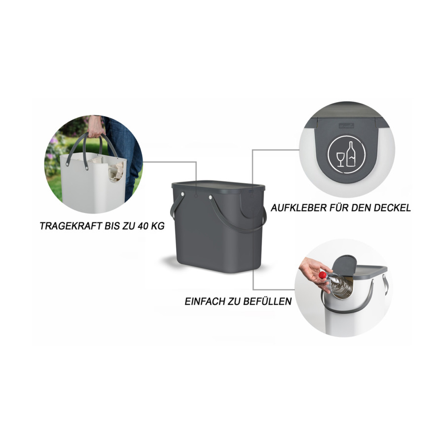 Ein praktischer Recyclingbehälter der sich super im Wohnbereich einbringen wird. Der Behälter ist stapelbar, einfach zu reinigen und durch die Tragegriffe bequem zu transportieren. Dank dem verschliessbarem Deckel weichen keine schlechten Gerüche nach aussen. Ausserdem, wird der Recyclingbehälter mit sechs Recyclingaufklebern geliefert, dadurch können Sie selber bestimmen ob Sie diesen für Glas, Karton, Papier, PET-Flaschen, Aluminiumdosen, Kunststoffe oder sonstigen recycelbaren Materialen nutzen möchten. Das Recyclingsystem ist in vier verschiedenen Farben erhältlich.