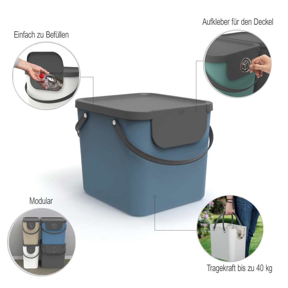 Ein praktischer Recyclingbehälter der sich super im Wohnbereich einbringen wird. Der Behälter ist stapelbar, einfach zu reinigen und durch die Tragegriffe bequem zu transportieren. Dank dem verschliessbarem Deckel weichen keine schlechten Gerüche nach aussen. Ausserdem, wird der Recyclingbehälter mit sechs Recyclingaufklebern geliefert, dadurch können Sie selber bestimmen ob Sie diesen für Glas, Karton, Papier, PET-Flaschen, Aluminiumdosen, Kunststoffe oder sonstigen recycelbaren Materialen nutzen möchten. Das Recyclingsystem ist in vier verschiedenen Farben erhältlich.