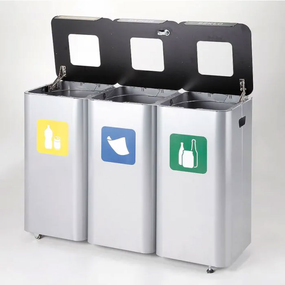 Eine schöne und hochwertige Recyclingstation aus verzinktem Stahl mit Korrosionsschutzbeschichtung für die Anwendung im Freien. Die Station hat höhenverstellbare Beine auf der einen Seite und Räder auf der anderen Seite mit seitlichen Griffen, was eine einfache Handhabung ermöglicht. Der Klappdeckel kann bei geöffneter Position arretiert und mit einem Dreikantschlüssel sicher verschlossen werden. Der Beutel ist sehr einfach mittels eingebauter Feder zu befestigen. Die 3 Kammern sind für einen Inhalt von 70 Liter geeignet.